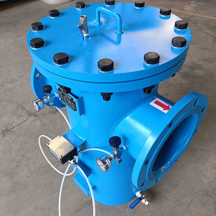 過濾器由殼體、多元濾芯、反沖洗機(jī)構(gòu)、和差壓控制器等部分組成。殼體內(nèi) 的橫隔板將其內(nèi)腔分為上、下兩腔,上腔內(nèi)配有多個過濾芯,這樣充分利用了過濾空間,顯著縮小了過濾器的體積,下腔內(nèi)安裝有反沖 洗吸盤。工作時,濁液經(jīng)入口進(jìn)入過濾器下腔,又經(jīng)隔板孔進(jìn)入濾芯的內(nèi)腔。大于過濾芯縫隙的雜質(zhì)被截留,凈液穿過縫隙到達(dá)上腔, 最后從出口送出。