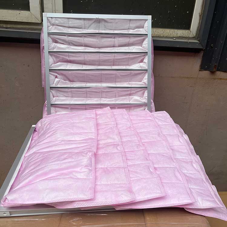 F7中效袋式空氣過(guò)濾器,顏色為粉紅色,效率80%~90% 常用袋數(shù)6個(gè),5個(gè),3個(gè);